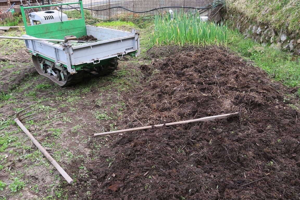 トップカーで運んだ堆肥を畑にすき込む。