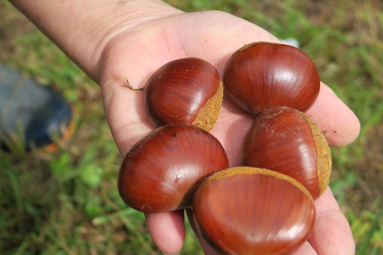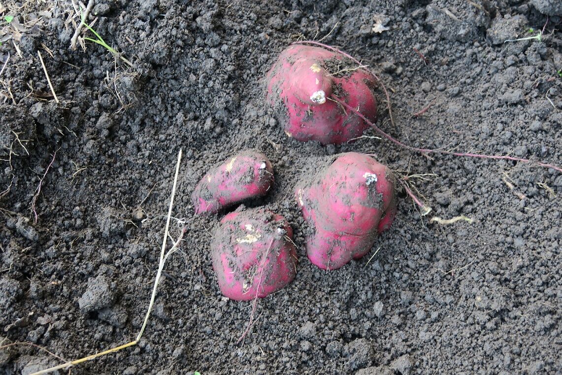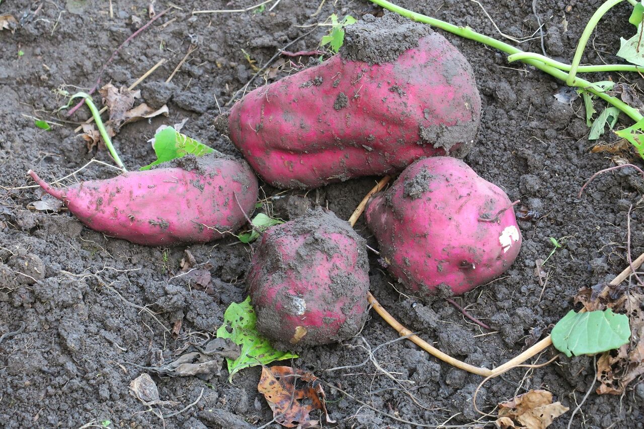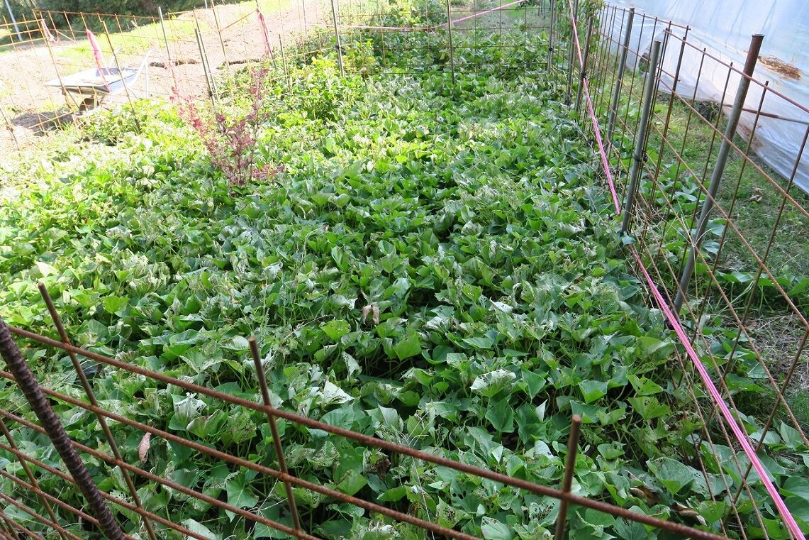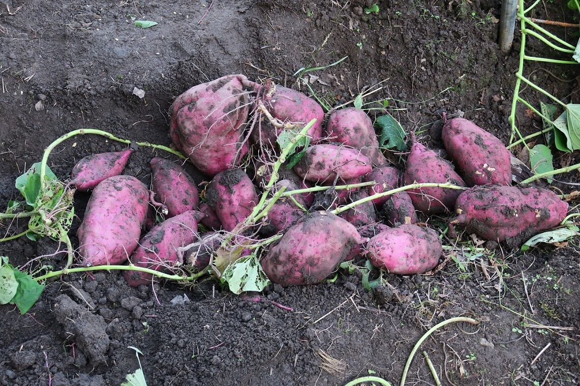 2020年10月28日 明るい農村 サツマイモの収穫 サツマイモ畑イノシシに食われんように柵で囲んでいる。イモズル式というように、ツルを引っ張るとイモが抜けるはずだけど、ツルがちぎれて抜けん。でっかい。これじゃ、抜けんわけだ。イモの皮に傷がつかんように掘らんとね。粒ぞろいにできたイモ後から、一輪車でえっちらおっちら運ぶわけ。ちょっと時期遅れになったけど・・・・・、大粒の甘みが強い栗だよ。栗ごはんは、秋の味。