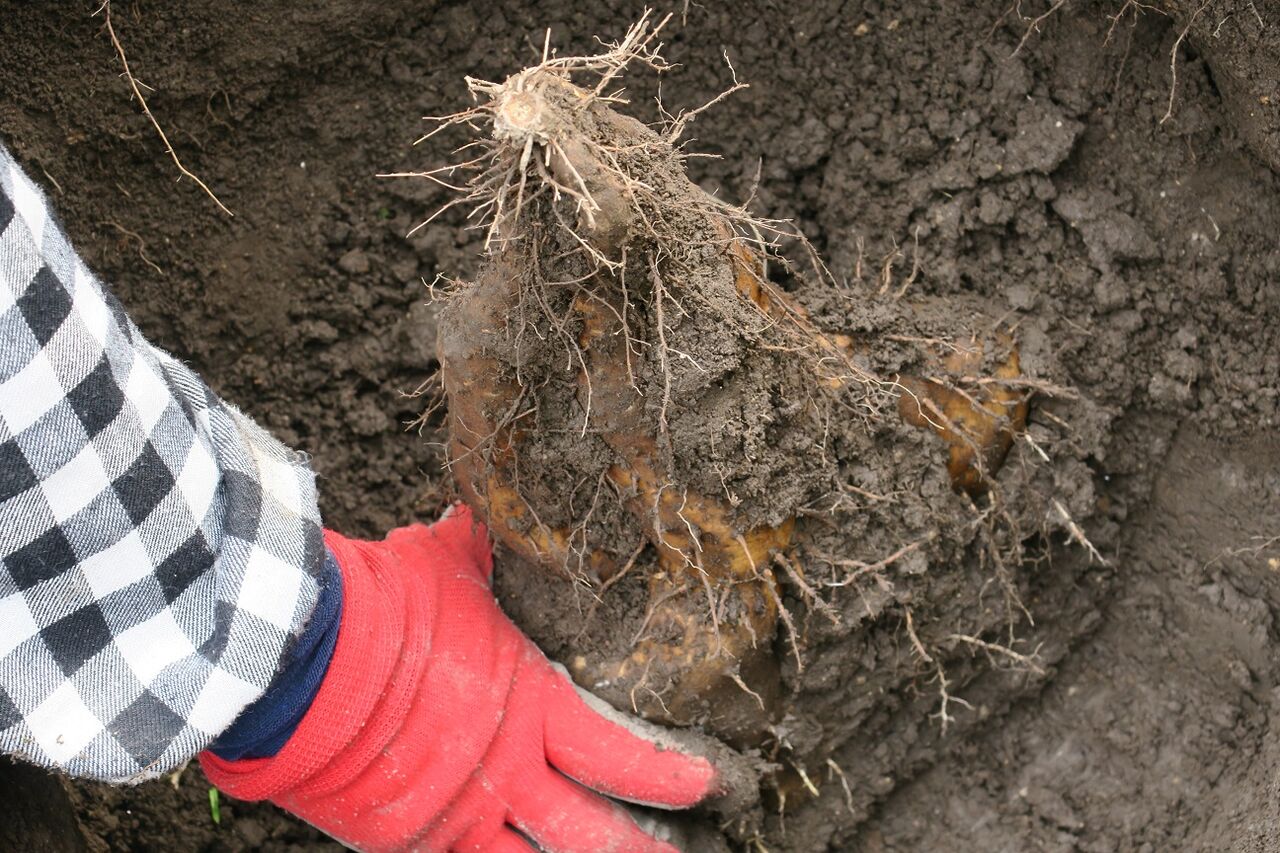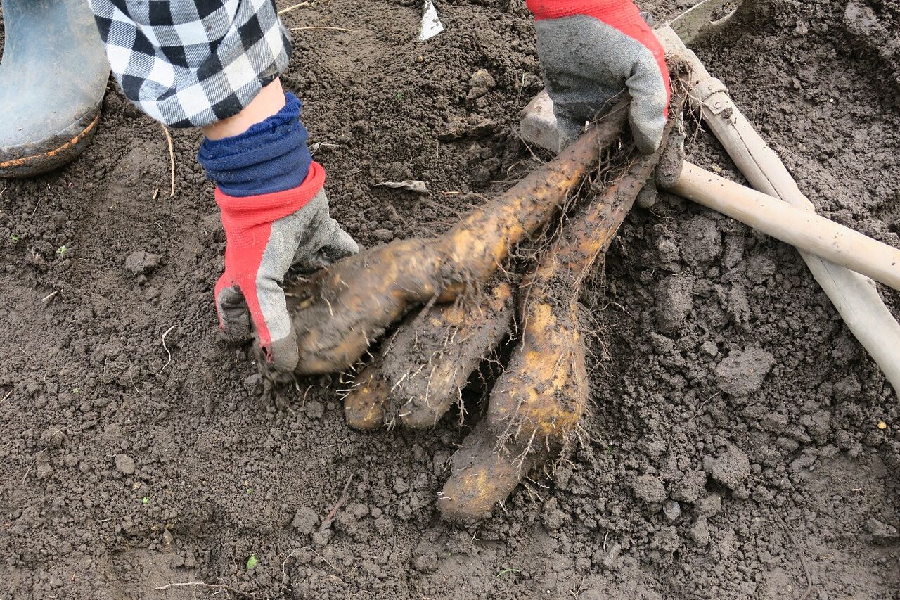 2020年10月29日 明るい農村 ヤマイモの収穫 ヤマイモ ええ感じに育ってるな。ムカゴもいっぱい。炒めて食ってもいいけど、これは種イモ。これを植えとけば、食べれるまでに3年はかかるけど、毎年順繰りに植えとけばいい話。もう、掘ってもよさそう。ここからが大変なんだよ。イモを傷けんように、女房を扱うのと同じくらい、気分を使って慎重に掘っていく。うわっ・・。