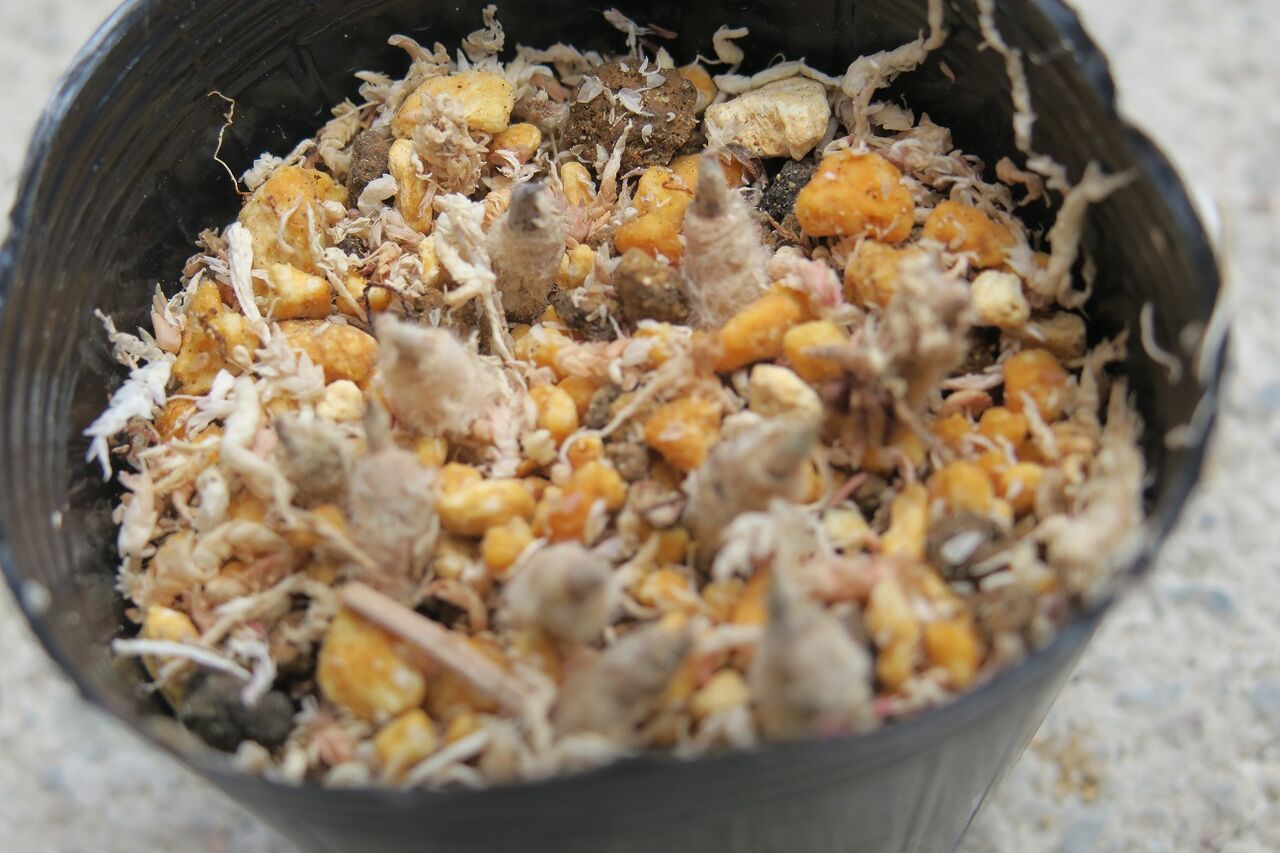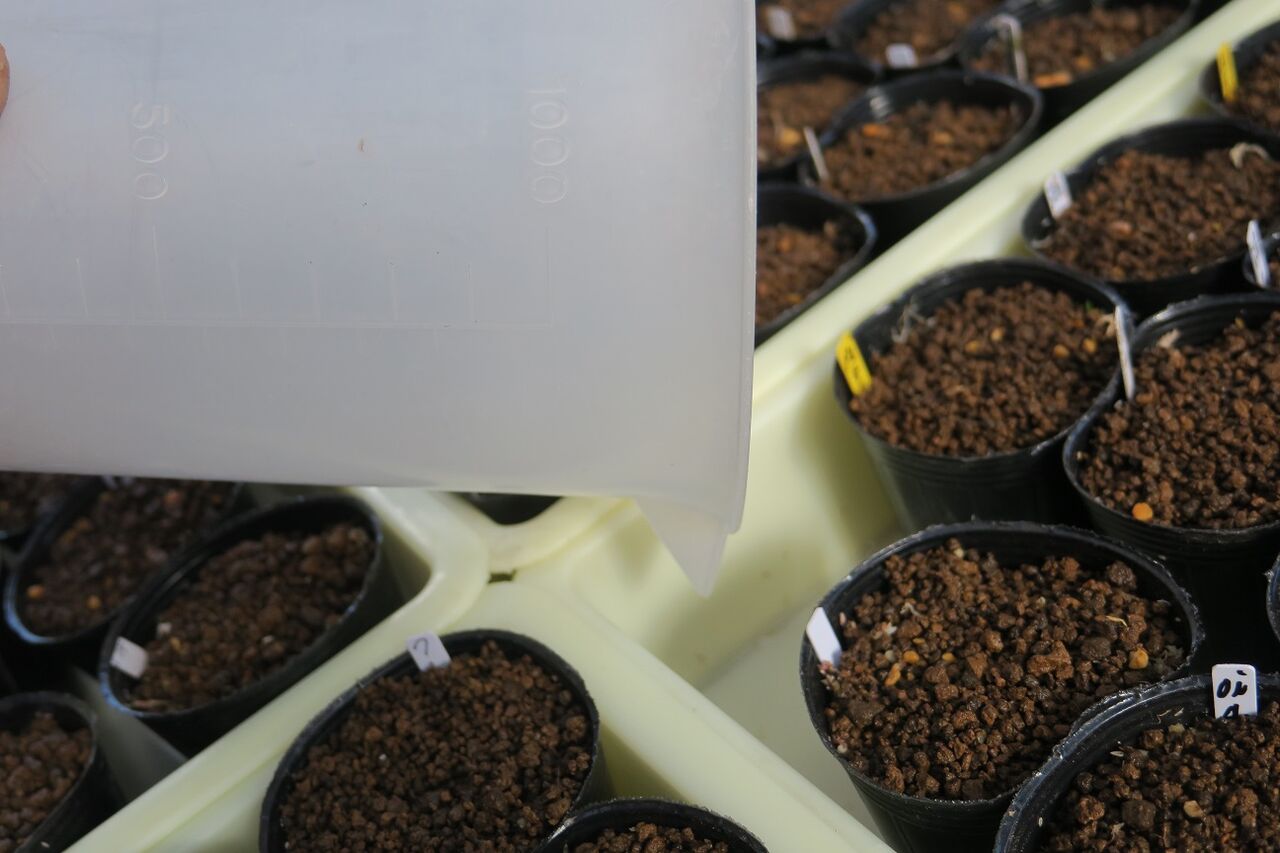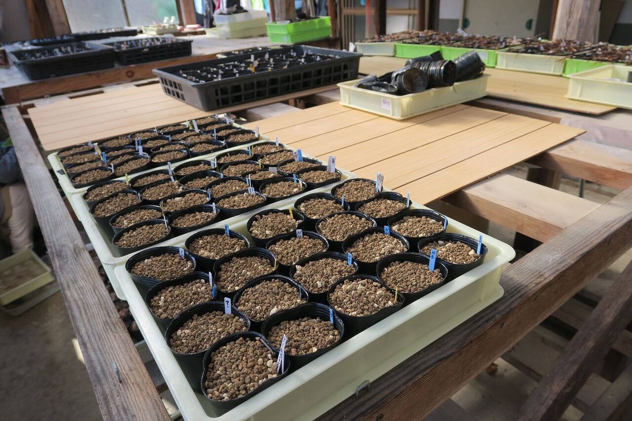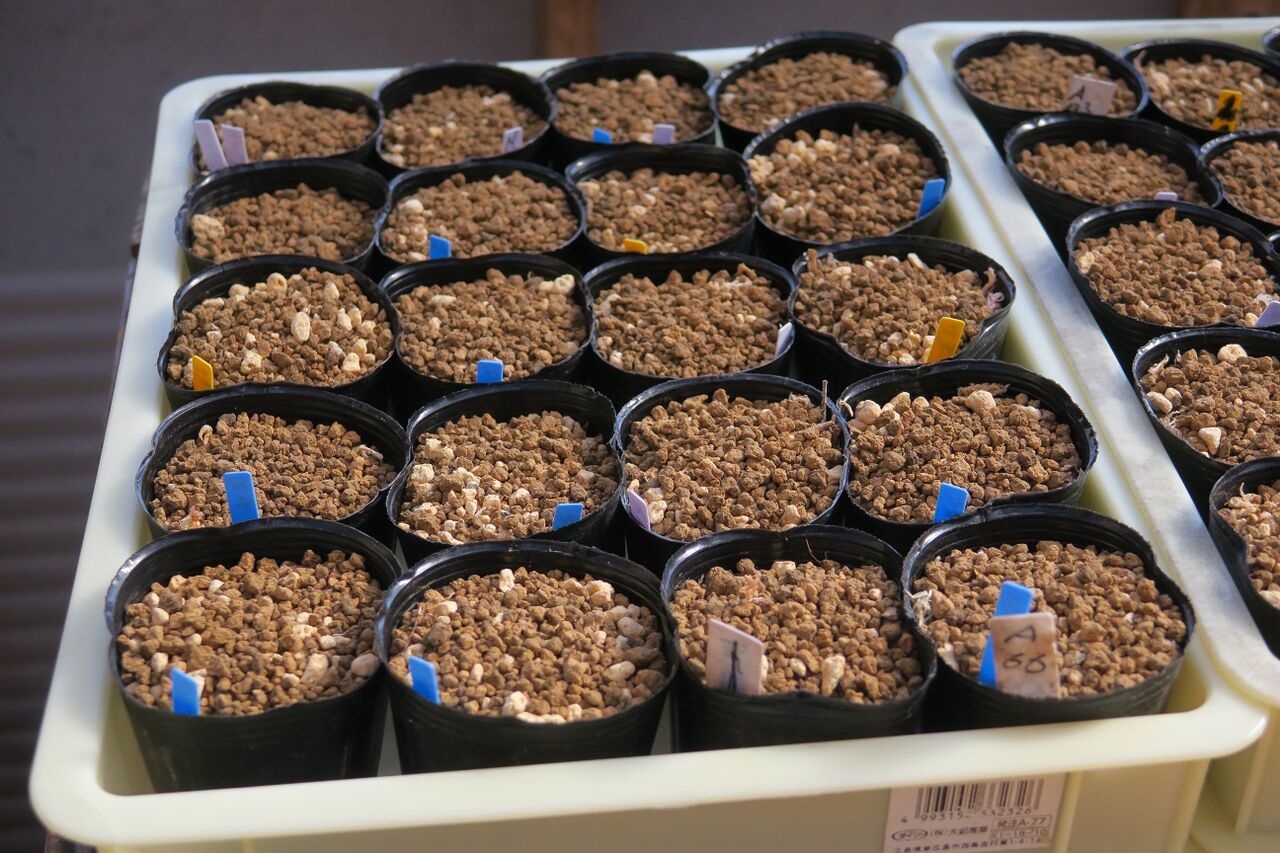 ダイソーの100均トレイに収納した植え込み済のポット