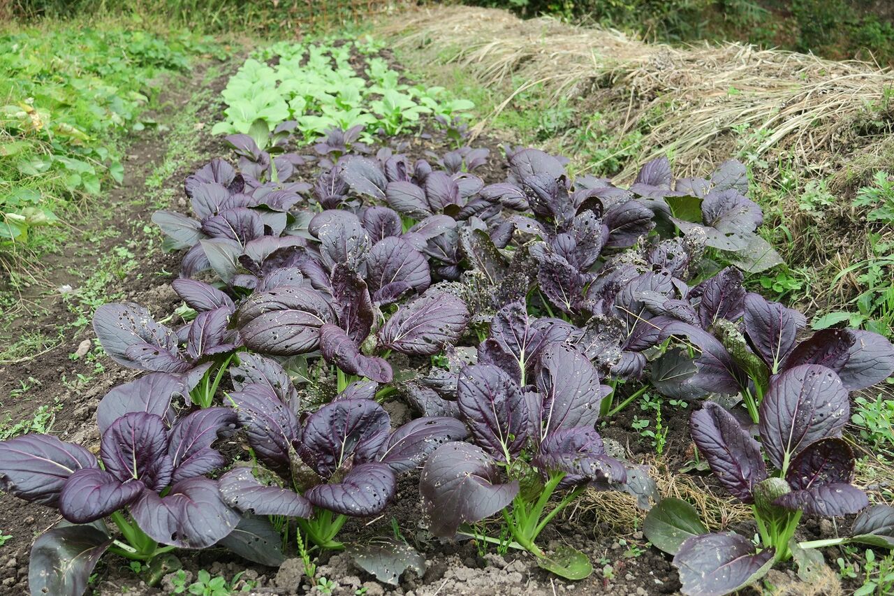 紫チンゲンサイも虫に食われてる。