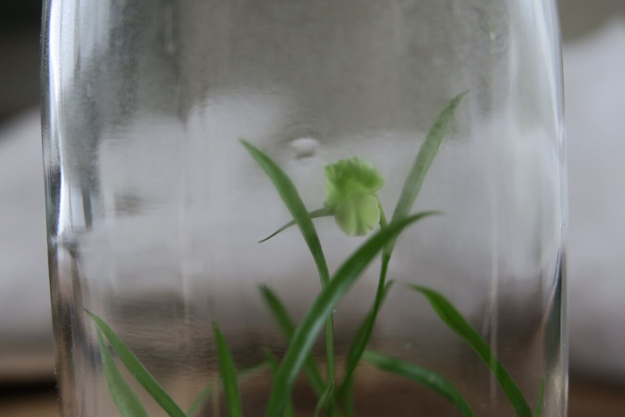 2022年06月26日 無菌培養 緑花交配 初花 ビンの中の初花ビンの中が曇ってるから、ちょっと見えにくいな。アングルを変えて、もう一枚もう一枚兜咲だね。わりかし、緑が濃いけど、喜ぶのは、まだ早い。来年、ビン出ししての結果だからね。♪ く~もりガラスを~ 手で ふいて~ あなた~ あしたが~ み~えますか~ ♪みえん みえん 白ボケするかも・・・。