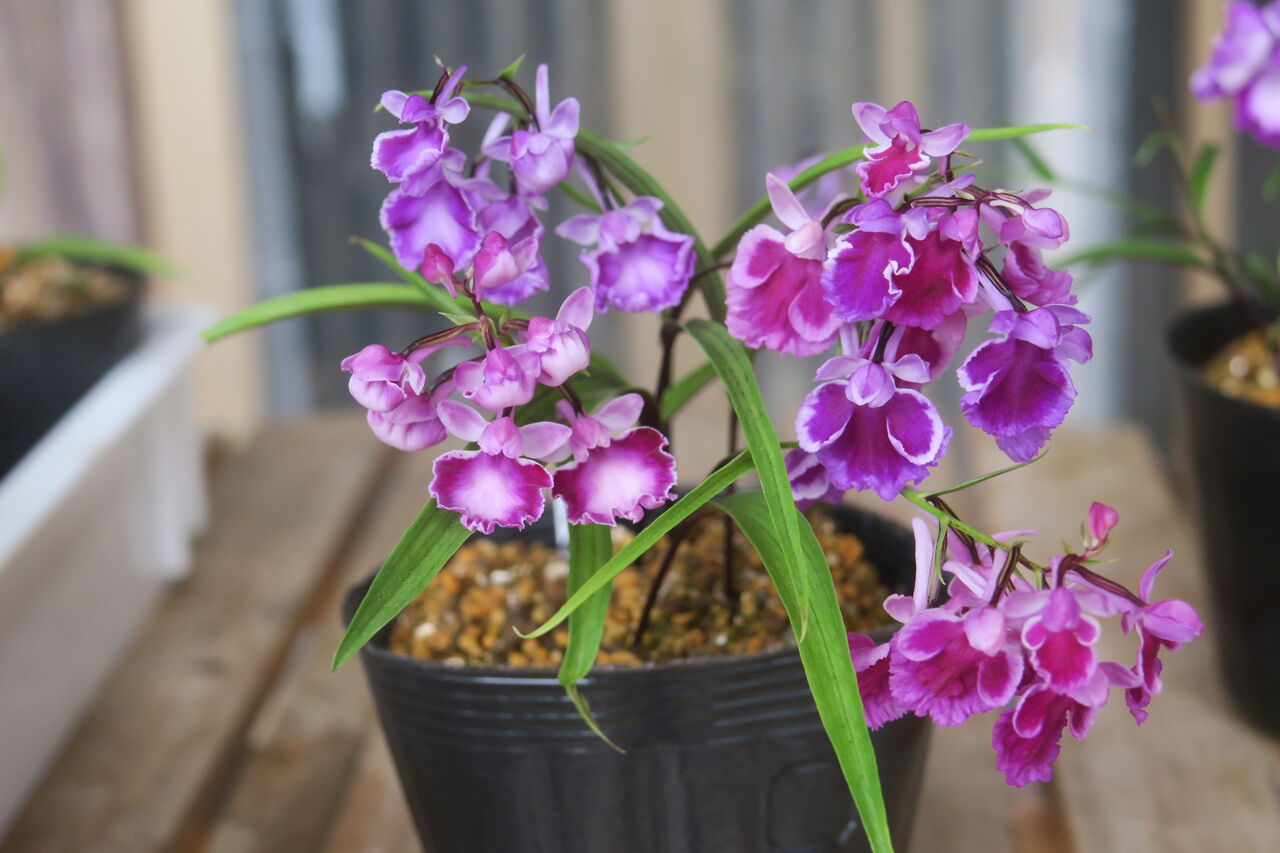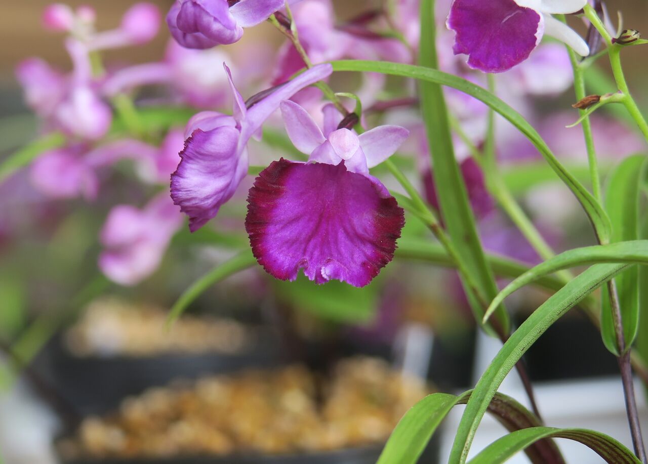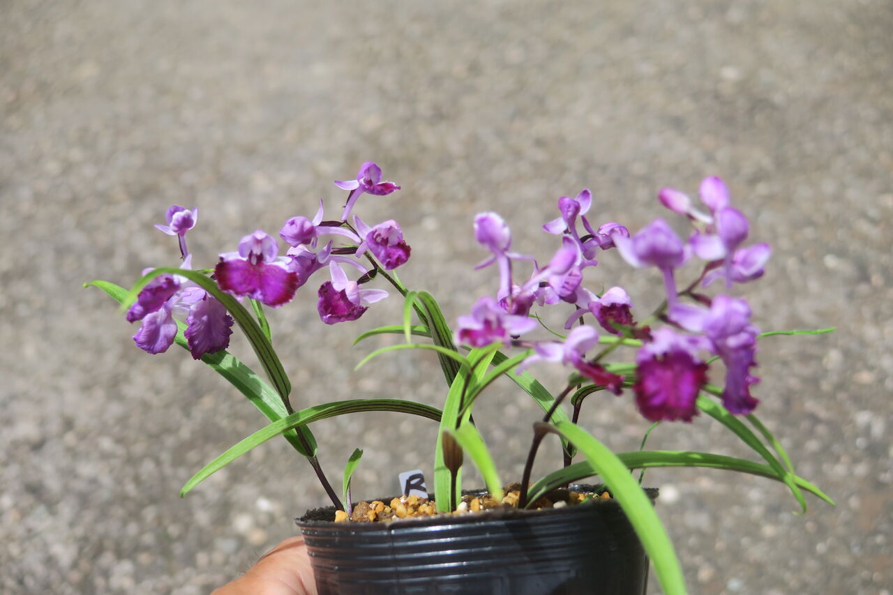 2023年06月27日 ウチョウラン 濃色覆輪 ちょっとピンボケ♀ 朱覆輪 × ♂ 紅赤 予想とは全く違った色味の花が咲いた。 つぼみをこじ開けてます。 シックな紫色から赤味を帯びた色まで、 微妙に変化のある花が咲いた。 画像アップ はっきり言って、そんなに期待もしていない交配だったから、 数ポットしか残していなかった。 ・・・がっくり。