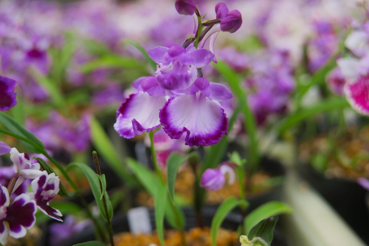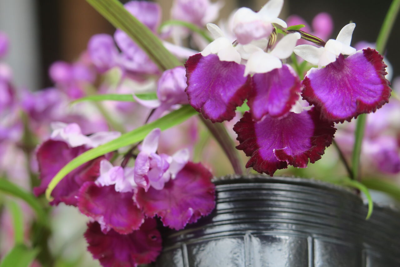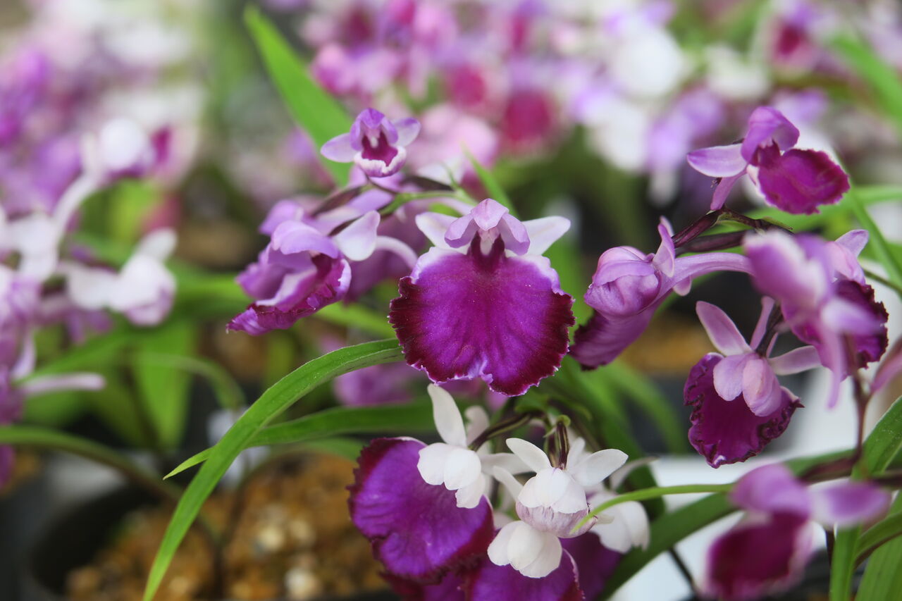 2023年06月27日 ウチョウラン 濃色覆輪 ちょっとピンボケ♀ 朱覆輪 × ♂ 紅赤 予想とは全く違った色味の花が咲いた。 つぼみをこじ開けてます。 シックな紫色から赤味を帯びた色まで、 微妙に変化のある花が咲いた。 画像アップ はっきり言って、そんなに期待もしていない交配だったから、 数ポットしか残していなかった。 ・・・がっくり。