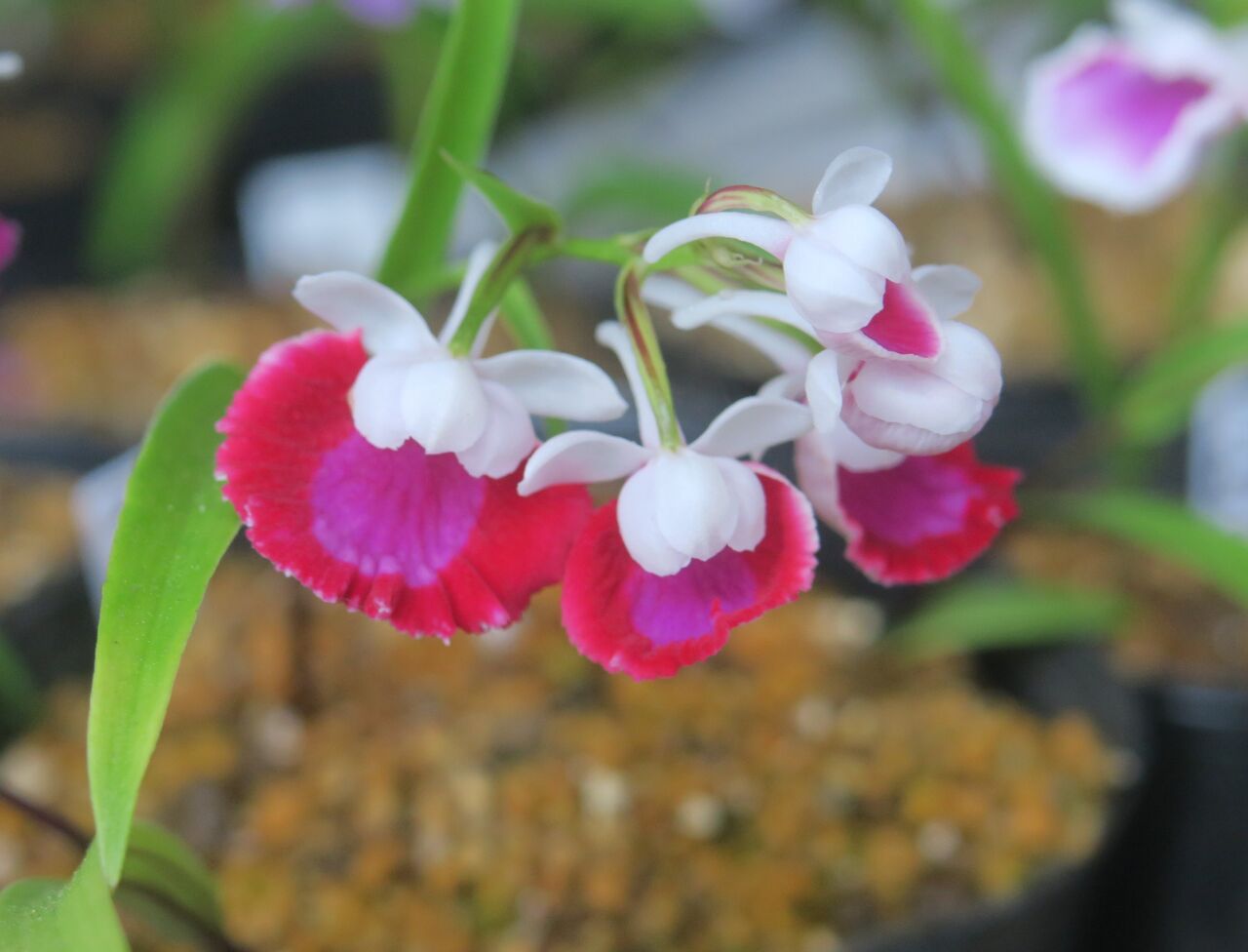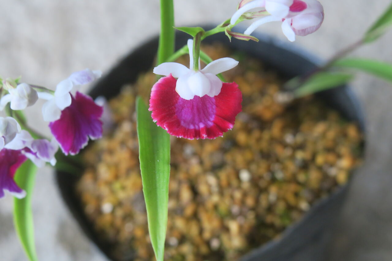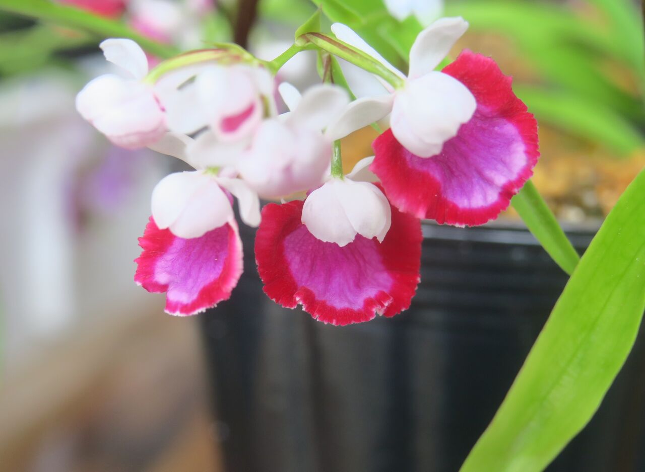 2023年06月25日 ウチョウラン 虹ぼかし ♀ 赤一虹ぼかし × ♂ 濃色大兜(朱花兜 × 紅一3蝶) ♀ 赤一虹ぼかしに兜の血がないから、兜の出現はあまり期待していなかった。もうちょっとメリハリがあってもいいようなんだけど・・・。こんなのも咲いたけど、まだ力がないからぱっと開かないな。花をちぎってこじ開けた。紅一 赤一 朱花 虹ぼかしの血が織り混ざっているから、交配親にしても良さそう。花粉を採取このタイプがほんの数本咲いた。どんな花と交配したらいいのか・・?